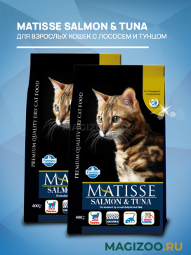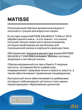 Обогащенная таурином рецептура корма MATISSE SALMON & TUNA обеспечивает Вашему питомцу здоровую и активную жизнь.