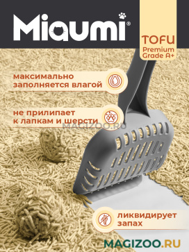 Отличительной особенностью наполнителя Miaumi TOFU Jasmine Scented являются премиальные гранулы диаметром 2 мм, обладающие способностью образовывать сверхпрочные комки при соприкосновении с жидкостью, которые впоследствии легко утилизируются в унитаз.