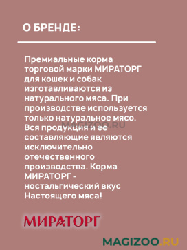 Премиальные корма торговой марки МИРАТОРГ для кошек и собак изготавливаются из натурального мяса. При производстве используется только натуральное мясо.