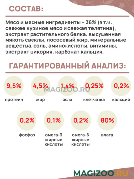 Мясо и мясные ингредиенты – 36% (в т.ч. свежее куриное мясо и свежая телятина), экстракт растительного белка, высушенная мякоть свеклы, лососевый жир, минеральные вещества, соль, аминокислоты, витамины, экстракт цикория, карбонат кальция.