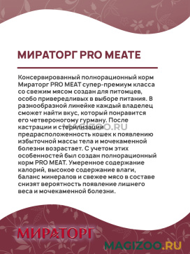 Консервированный полнорационный корм Мираторг PRO MEAT супер-премиум класса со свежим мясом создан для питомцев, особо привередливых в выборе питания. В разнообразной линейке каждый владелец сможет найти вкус, который понравится его четвероногому гурману.