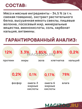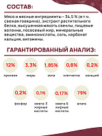 Мясо и мясные ингредиенты – 34,5 % (в т.ч. свежая говядина), экстракт растительного белка, высушенная мякоть свеклы, пищевые волокна, лососевый жир, минеральные вещества, аминокислоты, соль, карбонат кальция, витамины.