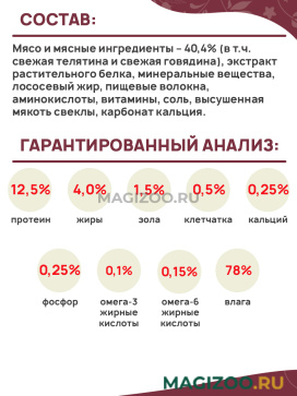 Мясо и мясные ингредиенты – 40,4 % (в т.ч. свежая телятина и свежая говядина), экстракт растительного белка, минеральные вещества, лососевый жир, пищевые волокна, аминокислоты, витамины, соль, высушенная мякоть свеклы, карбонат кальция.