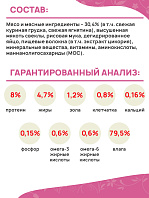 Мясо и мясные ингредиенты – 29,2 % (в т.ч. свежая куриная грудка, свежая ягнятина), рисовая мука, лососевый жир, высушенная мякоть свеклы, дегидрированное яйцо, пищевые волокна (в т.ч. экстракт цикория), минеральные вещества, витамины, карбонат кальция, аминокислоты, маннанолигосахариды (МОС).