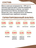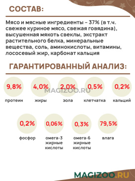 Мясо и мясные ингредиенты – 43% (в т.ч. свежее куриное мясо и свежая говядина), высушенная мякоть свеклы, экстракт растительного белка, минеральные вещества, соль, аминокислоты, витамины, лососевый жир.