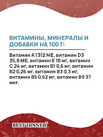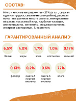 Мясо и мясные ингредиенты – 27% (в т.ч., свежая куриная грудка, свежее мясо индейки), рисовая мука, высушенная мякоть свеклы, минеральные веществ, лососевый жир, карбонат кальция, аминокислоты, витамины, пищевые волокна, экстракт расторопши, L-карнитин.