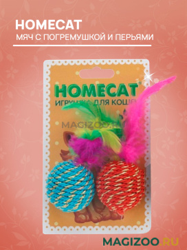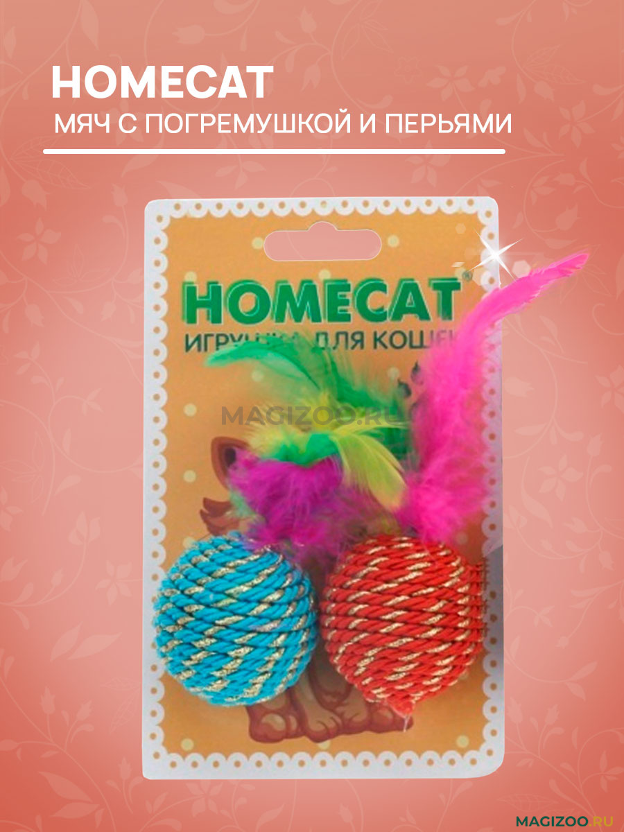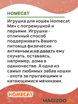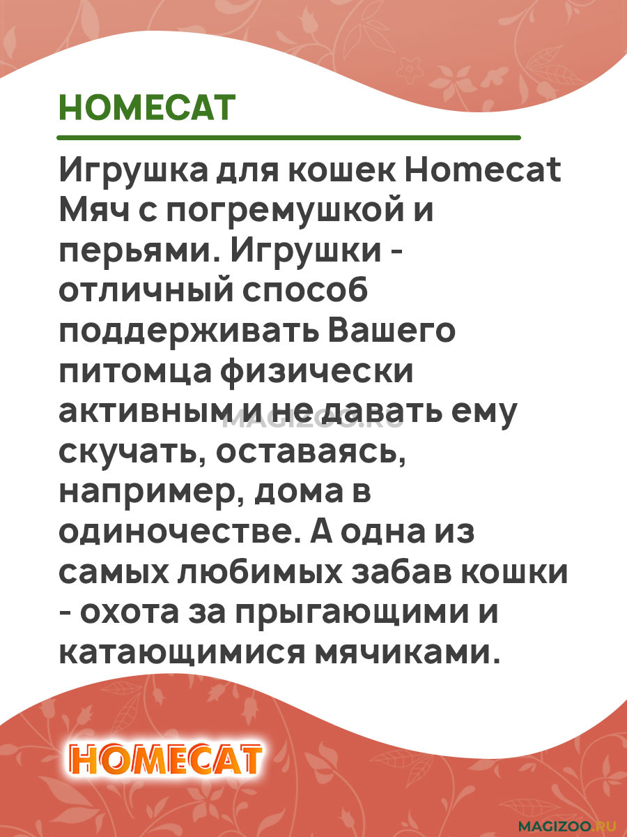 Игрушка для кошек Homecat Мяч с погремушкой и перьями. Игрушки - отличный способ поддерживать Вашего питомца физически активным и не давать ему скучать, оставаясь, например, дома в одиночестве. А одна из самых любимых забав кошки - охота за прыгающими и катающимися мячиками.