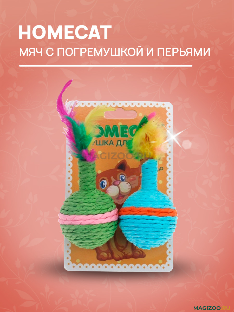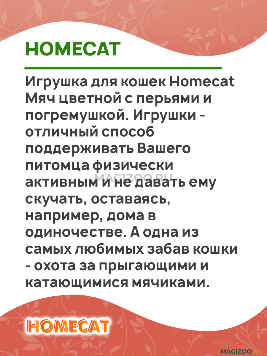 Игрушка для кошек Homecat Мяч цветной с перьями и погремушкой. Игрушки - отличный способ поддерживать Вашего питомца физически активным и не давать ему скучать, оставаясь, например, дома в одиночестве. А одна из самых любимых забав кошки - охота за прыгающими и катающимися мячиками.