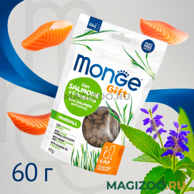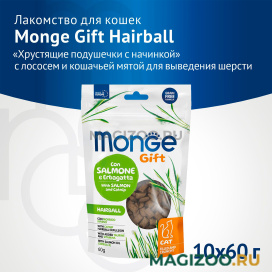 Лакомство MONGE GIFT HAIRBALL для кошек "Хрустящие подушечки с начинкой" с лососем и кошачьей мятой для вывода шерсти.