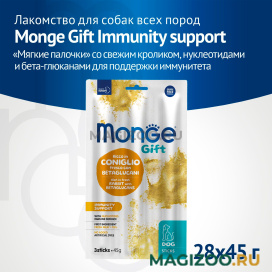 Лакомство MONGE GIFT IMMUNITY SUPPORT для собак всех пород "Мягкие палочки" со свежим кроликом, нуклеотидами и бета-глюканами для поддержки иммунитета.