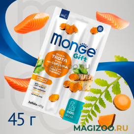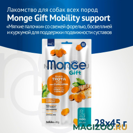Лакомство MONGE GIFT MOBILITY SUPPORT для собак всех пород "Мягкие палочки" со свежей форелью, босвеллией и куркумой для поддержки подвижности суставов.