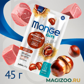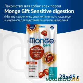 Лакомство MONGE GIFT SENSITIVE DIGESTION для собак всех пород "Мягкие палочки" со свежим ягненком, каштаном и инулином для чувствительного пищеварения 45 г.