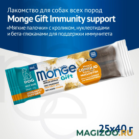 Лакомство MONGE GIFT IMMUNITY SUPPORT для собак всех пород "Мясные батончики" с кроликом, нуклеотидами и бета-глюканами для поддержки иммунитета.