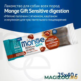 Лакомство MONGE GIFT SENSITIVE DIGESTION для собак всех пород "Мясные батончики" с ягненком, каштаном и инулином для чувствительного пищеварения.