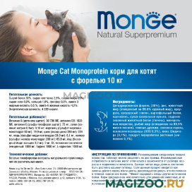 Специалисты компании большое внимание уделяют вкусовой привлекательности рационов, которая достигается с помощью использования свежего мяса в процессе производства, без добавления усилителей вкуса, красителей и искусственных консервантов. Сбалансированные натуральные ингредиенты, входящие в состав кормов MONGE, обогащены витаминами, макро- и микроэлементами, необходимыми для правильного развития котят и поддержания здоровья взрослых кошек.