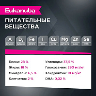 Рис, кукурузная клейковина, курица (дегидрированная 18%, свежая 5%), рыба (дегидрированный лосось), животный жир (куриный жир 99,6%, консервированный с помощью натуральных антиоксидантов), овес, гидролизированный животный белок (печень), дегидрированный горох, яичный порошок, рыбий жир (масло лосося 99,5%), 1 % минеральные вещества, дрожжевые продукты (маннанолигосахариды 1 %, ксилоолигосахариды 0,3 %, юкка Шидигера 0,1 %)