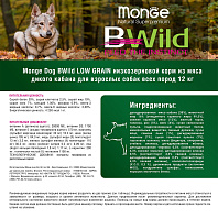 Рацион является уникальным продуктом в линейке кормов Monge, поскольку только он создан на основе мяса дикого кабана, которое считается одним из наиболее ценных источников полноценного легкоусвояемого белка.