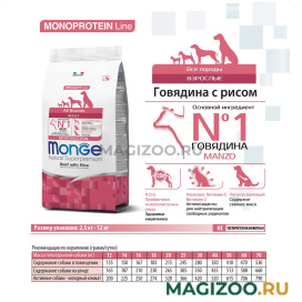 Здоровье и продолжительность жизни собак напрямую зависят от их питания. Суперпремиальные корма MONGE разработаны с учетом диетических потребностей собак, способствуют поддержанию оптимального веса животных в соответствии с их возрастом и уровнем активности. Специалисты компании большое внимание уделяют вкусовой привлекательности рационов, которая достигается с помощью использования свежего мяса в процессе производства, без добавления усилителей вкуса, красителей и искусственных консервантов. Сбалансированные натуральные ингредиенты, входящие в состав кормов MONGE, обогащены витаминами, макро- и микроэлементами, необходимыми для правильного развития щенков и поддержания здоровья взрослых собак. Высококачественные белки и жиры животного происхождения, а также комплекс витаминов и минералов являются основой ежедневного рациона животных. Вам больше не придется ломать голову, как составить такой рацион, если Вы доверитесь специалистам компании MONGE. В линейке кормов суперпремиум-класса из натуральных ингредиентов Вы сможете найти тот, который удовлетворит потребности именно Вашей собаки! В ЧЕМ ОТЛИЧИЕ MONGE SPECIALITY LINE? Линейка полноценных сбалансированных рационов для взрослых собак Speciality Line предназначена для животных, склонных к аллергическим реакциям и расстройствам пищеварения. В состав каждого продукта линейки входит только один белок животного происхождения, что позволяет легко исключить из рациона ингредиенты, вызывающие аллергию. Высокая усвояемость корма гарантирует поступление в организм оптимального количества питательных веществ, необходимых собакам с чувствительным пищеварением. Оптимальный баланс Омега-6 и Омега-3 жирных кислот снижает риск развития воспаления и гарантирует превосходное состояние кожного покрова. Содержание в корме биотина, цинка и высокого уровня линолевой кислоты придает шерсти питомца блеск. Не содержит ГМО, красителей и консервантов.