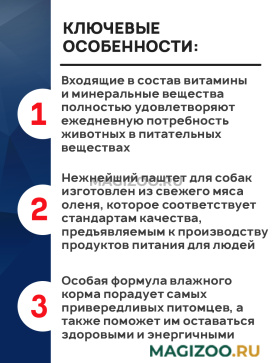 - Нежнейший паштет для собак изготовлен из свежего мяса оленя, которое соответствует стандартам качества, предъявляемым к производству продуктов питания для людей.
