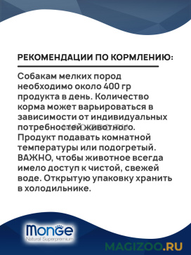 Рекомендации по кормлению: собакам мелких пород необходимо около 400 гр продукта в день. Количество корма может варьироваться в зависимости от индивидуальных потребностей животного. Продукт подавать комнатной температуры или подогретый. ВАЖНО, чтобы животное всегда имело доступ к чистой, свежей воде. Открытую упаковку хранить в холодильнике.