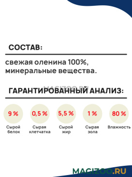 Состав: свежая оленина 100%, минеральные вещества.
