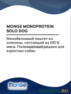 Монобелковый паштет из оленины, состоящий из 100 % мяса. Полноценный рацион для взрослых собак.