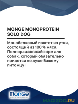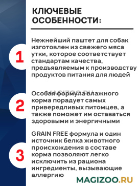 Монобелковый паштет из утки, состоящий из 100 % мяса. Полнорационный корм для собак, который обязательно придется по душе Вашему питомцу!