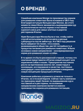 Информация о составе и ингредиентах, цветовом решении, технических и иных характеристиках, стране-изготовителе, внешнем виде и комплекте поставки товара носит справочный характер и основана на последних доступных к моменту публикации сведениях. Доставка данного товара осуществляется во все регионы РФ.Идея Бальдассара Монжа была в том, чтобы найти способ использовать остатки мяса и мясные субпродукты после забоя кур. И в 1963 году решение было найдено! Он понял, что в новом, развивающемся обществе, растёт потребность в продуктах питания для домашних животных. И было основано новое направление – консервированные корма для домашних кошек и собак.