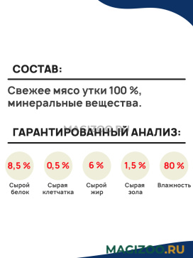 Состав: Свежее мясо утки 100 %, минеральные вещества.