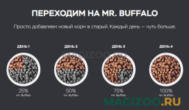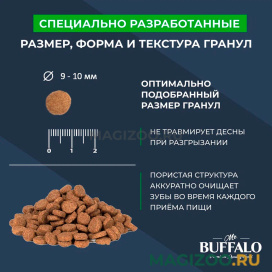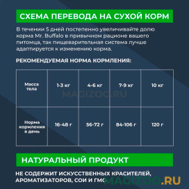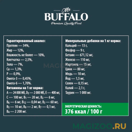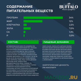 Mr.Buffalo — сбалансированный корм, созданный с учётом особенностей и потребностей Ваших питомцев. Чтобы обеспечить вашего любимца качественным питанием, мы включили в него животный белок, качественные жиры и использовали передовые технологии на сегодняшний день.