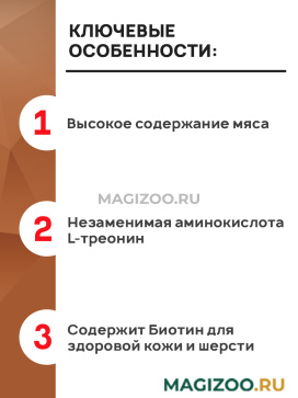 Высокое содержание мяса. Благодаря этому корм легко переваривается и усваивается, обладает отличными вкусовыми качествами и подойдёт даже привередливым питомцам.