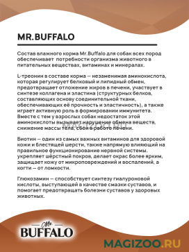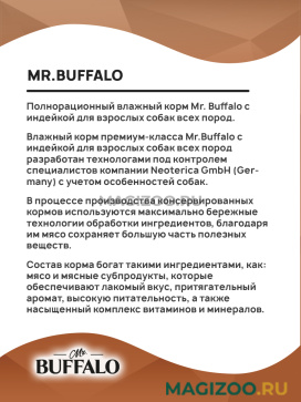 Влажный корм премиум-класса Mr.Buffalo с индейкой для взрослых собак всех пород разработан технологами под контролем специалистов компании Neoterica GmbH (Germany) с учетом особенностей собак.