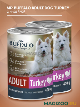 Полнорационный влажный корм Mr. Buffalo с индейкой для взрослых собак всех пород.