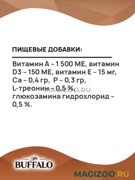 Состав корма богат такими ингредиентами, как: мясо и мясные субпродукты, которые обеспечивают лакомый вкус, притягательный аромат, высокую питательность, а также насыщенный комплекс витаминов и минералов. Состав влажного корма Mr.Buffalo для собак всех пород обеспечивает потребности организма животного в питательных веществах, витаминах и минералах.