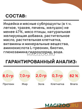 Индейка и мясные субпродукты (в т.ч. легкое, трахея, печень, желудок) не менее 47%, мясо птицы, натуральная желирующая добавка, растительное масло, растительная клетчатка, витамины и минеральные вещества, аминокислота L-треонин, биотин, глюкозамина гидрохлорид, вода.