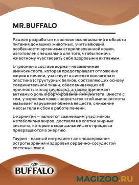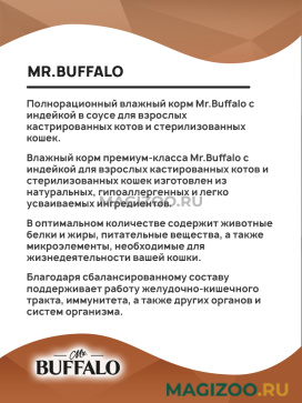 Влажный корм премиум-класса Mr.Buffalo с индейкой для взрослых кастированных котов и стерилизованных кошек изготовлен из натуральных, гипоаллергенных и легко усваиваемых ингредиентов.