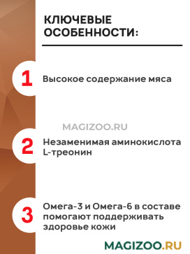 Высокое содержание мяса. Благодаря этому корм легко переваривается и усваивается, обладает отличными вкусовыми качествами и подойдёт даже привередливым питомцам.