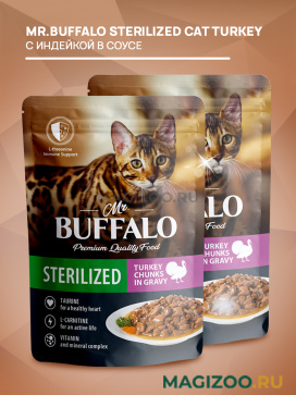 Полнорационный влажный корм Mr.Buffalo с индейкой в соусе для взрослых кастрированных котов и стерилизованных кошек.
