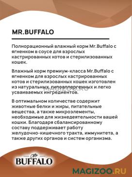 Влажный корм премиум-класса Mr.Buffalo с ягненком для взрослых кастрированных котов и стерилизованных кошек изготовлен из натуральных, гипоаллергенных и легко усваиваемых ингредиентов.