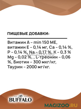Витамин А – min 150 МЕ, витамин Е – 0,14 мг, Ca – 0,14 %, P – 0,14 %, Na – 0,17 %, K – 0,3 % Mg – 0,02 %, , L-треонин – 0,06 %, Биотин – 300 мкг/кг, Таурин – 2000 мг/кг.