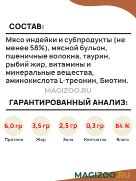 Мясо индейки и субпродукты (не менее 58%), мясной бульон, пшеничные волокна, таурин, рыбий жир, витамины и минеральные вещества, аминокислота L-треонин, Биотин.