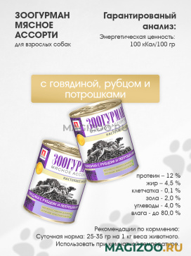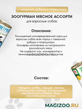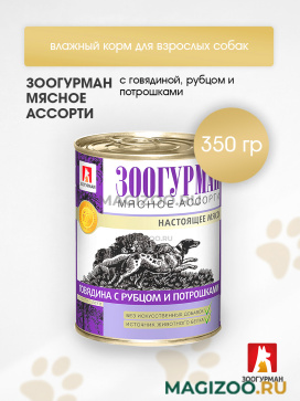 Полноценный консервированный корм для взрослых собак всех пород с говядиной, рубцом и потрошками.