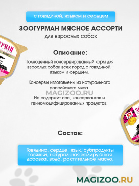 Полноценный консервированный корм для взрослых собак всех пород с говядиной, языком и сердцем.