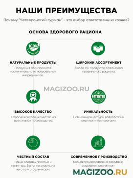 Четвероногий Гурман предлагает разнообразный ассортимент, который позволяет составить правильный рацион, отвечающий потребностям именно Вашего любимца. Все корма 100 % натуральны, не содержат сои, ГМО, искусственных красителей и ароматизаторов.
