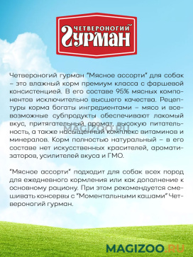 Консервы Четвероногий Гурман МЯСНОЕ АССОРТИ выпускаются уже более 10 лет, и спрос на них только растёт. Это корм, в составе которого содержится 95% мясных компонентов исключительно высшего качества. Рецептуры корма богаты по ингредиентам - мясо и всевозможные субпродукты обеспечивают лакомый вкус и притягательный аромат, высокую питательность, а также насыщенный комплекс витаминов и минералов. Не содержат злаков, бобовых и овощей, а также синтетических витаминно-минеральных комплексов.