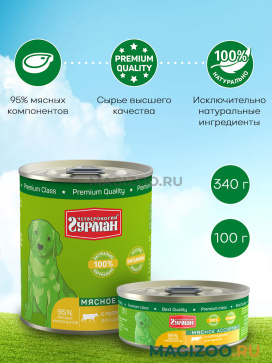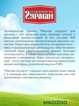 Консервы Четвероногий Гурман МЯСНОЕ АССОРТИ выпускаются уже более 10 лет, и спрос на них только растёт. Это корм, в составе которого содержится 95% мясных компонентов исключительно высшего качества. Р