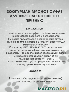 Вся продукция ЗООГУРМАН не содержит сои, консервантов и ароматизаторов. В этом нет необходимости, так как нет ничего вкуснее натурального мяса!