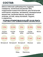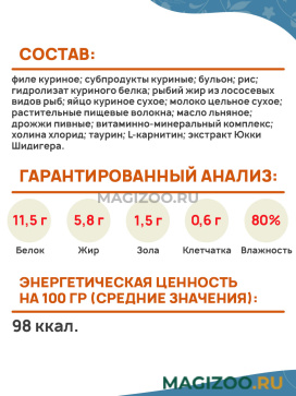 Состав: филе куриное; субпродукты куриные; бульон; рис; гидролизат куриного белка; рыбий жир из лососевых видов рыб; яйцо куриное сухое; молоко цельное сухое; растительные пищевые волокна; масло льняное; дрожжи пивные; витаминно-минеральный комплекс; холина хлорид; таурин; L-карнитин; экстракт Юкки Шидигера.