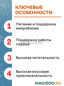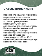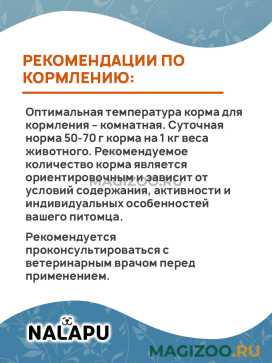Оптимальная температура корма для кормления – комнатная. Суточная норма 50-70 г корма на 1 кг веса животного. Рекомендуемое количество корма является ориентировочным и зависит от условий содержания, активности и индивидуальных особенностей вашего питомца.