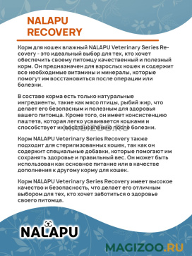 Корм NALAPU Veterinary Series Recovery имеет высокое качество и безопасность, что делает его отличным выбором для тех, кто хочет заботиться о здоровье своего питомца.